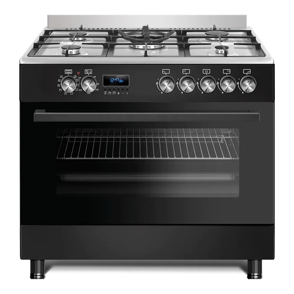 • 90cm F/S Oven, 5 Sabaf Burner Gas Cooktop, Black Anthracite, Cast Iron Trivets, Wok Support, 121L 10 Function Oven, Digital Clock/Timer, Twin Cavity Fan, Storage Drawer, 2 x Wire Racks, 1 x Baking Tray, 1 x Telescopic Rails, Adjustable Legs, Made In Europe