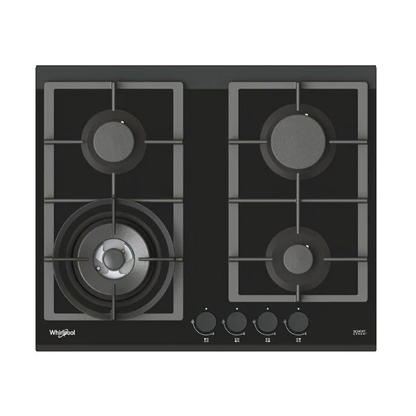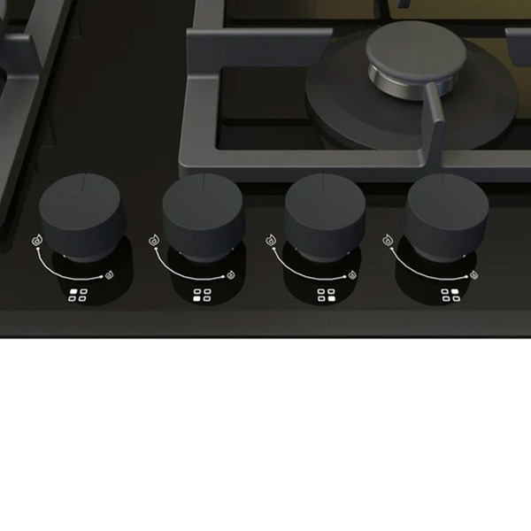 Sleek in black, gas cooktop on glass is classy with front bevelled finish, and black knobs, to fit any kitchen design.